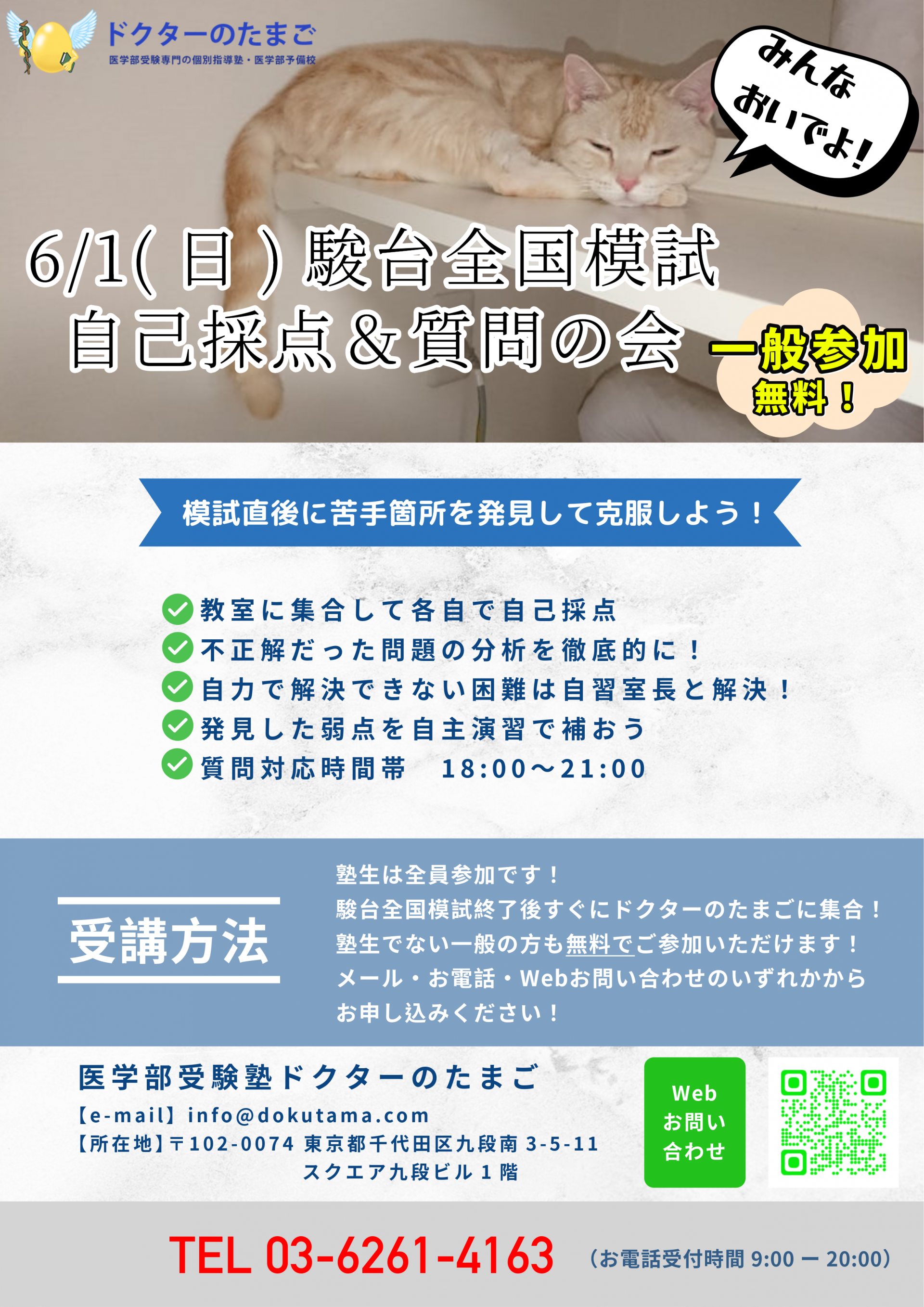 | 2019.06.21 | ドクターのたまご猫藤先生が、ブログを更新しました。 「合格は夏までの頑張りにかかっている! 」~ 浪人生の皆さんへ https://ameblo.jp/dokutama-nekohuji/entry-12484152139.html